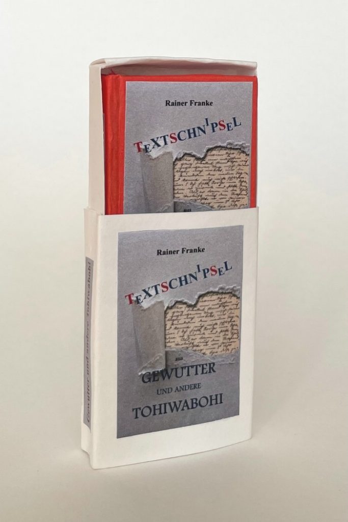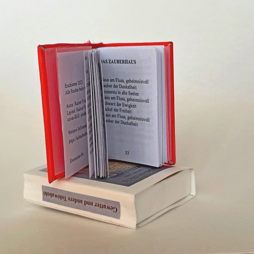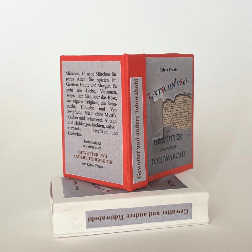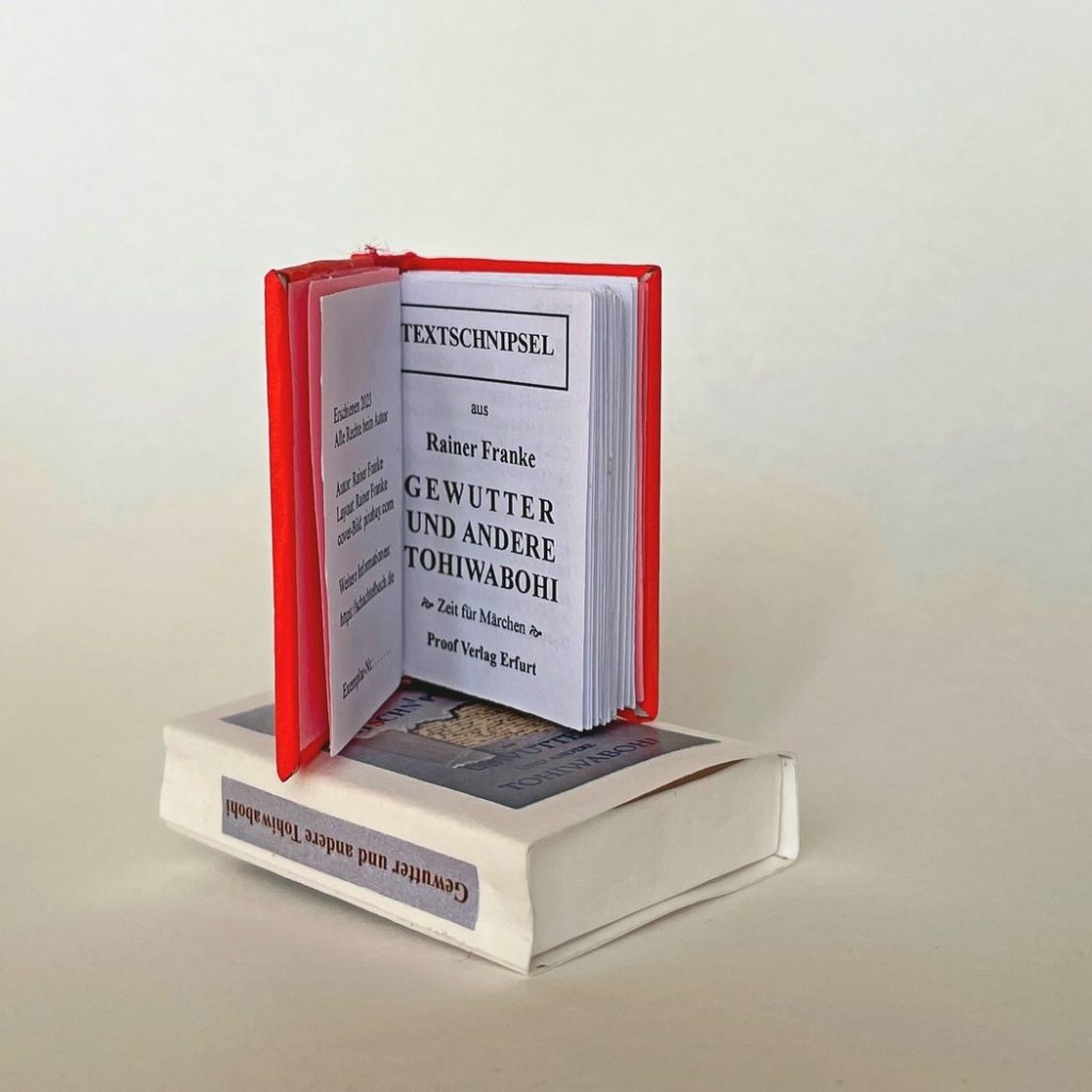 Und Trara, Trommelwirbel: Hier ist es: mein erstes Schachtelbuch! Es hat 64 Seiten, passt in eine Schachtel, misst ca. 3,2 x 4,5 cm und trägt stolz die Nummer 1. Ich habe darin Textschnipsel aus meinem 2023 im Proof Verlag Erfurt erschienenen Buch „Gewutter und andere Tohiwabohi – Zeit für Märchen“ untergebracht. Mehr über dieses Buch erfährt man in meinem Blog und auf der Verlagsseite.